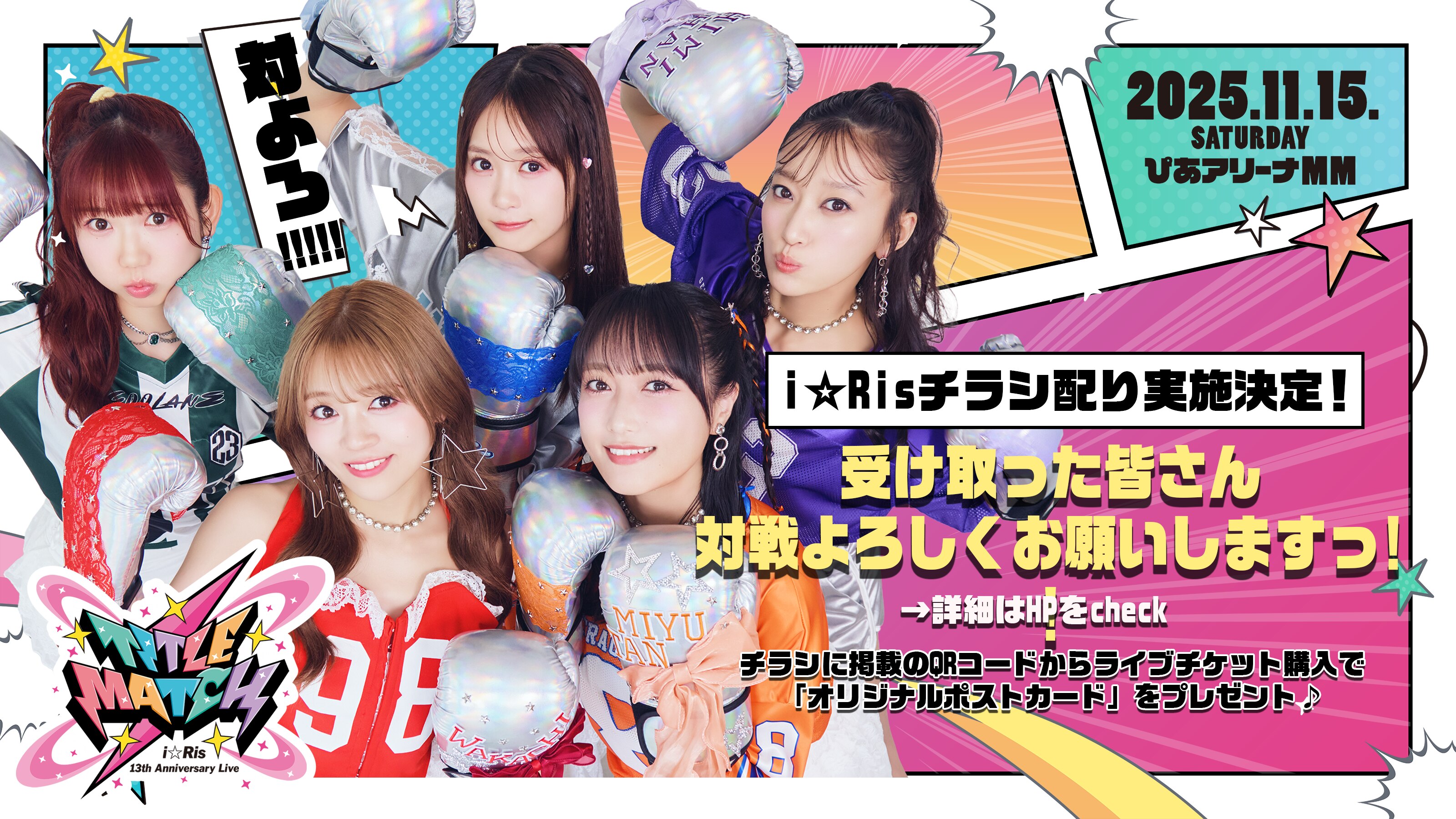i☆Risのメンバーがそれぞれ様々な土地に訪れて、チラシ配りをさせていただきますので、チラシを受け取った方はチラシに掲載のQRコードから、i☆Ris 13th Anniversary Live -TITLE MATCH-のライブチケットをご購入ください♪